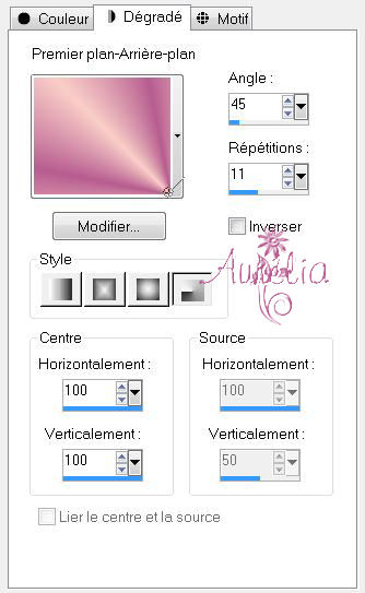 Préparer un dégradé radial H : 100, V : 100 45/11 ; avec en avant plan b75c90 et en arrière plan fecec7