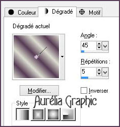 Préparez un dégradé linéaire 45/0, avec en avant plan dcddcf, et en arrière plan ca5975